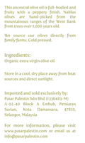 This artisanal olive oil is full-bodied and fruity with a peppery finish. Nablus olives are hand-picked from West Bank’s mountainous olive trees, many over 1,000 years old.